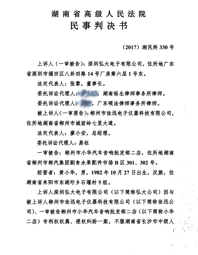 代理郴州市佳迅电子专利权属、侵权纠纷案二审胜诉发表时间:2018-05-23 11:48 深圳弘大电子有限公司与郴州市佳迅电子仪器科技有限公司就专利权权属、侵权纠纷一案,深圳弘大电子有限公司不服长沙市中级人民法院(2016)湘01民初1454号民事判决,向湖南省高级人民法院提起诉讼,郴州市佳迅电子仪器科技有限公司委托湖南专业知识产权专利律师易柱律师团队进行代理,该案经过湖南省高级人民法院公开开庭审理,认为深圳弘大电子有限公司的各项上述请求缺乏事实和法律依据,本院均不予支持。一审判决认定事实清楚,适用法律正确,依法应予维持。并作出(2017)湘民终330号判决:驳回上述,维持原判。二审案件受理费1600元,由上诉人深圳弘大电子有限公司负担。该案经过代理人的充分阐述充分地维护了郴州市佳迅电子仪器科技有限公司的合法权益,得到了当事人的极力好评。